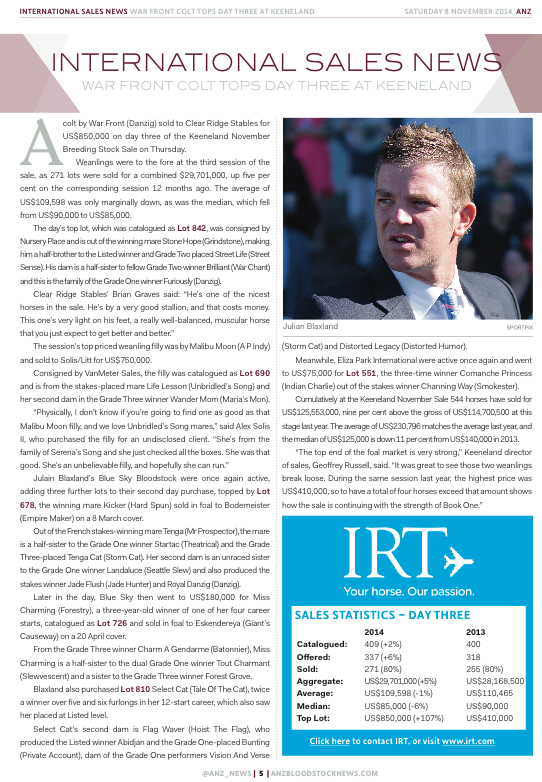 Blue Sky Continue Buying At Keeneland November Sale November 12, 2014 Julian Blaxland ANZ Bloodstock News, November 8th