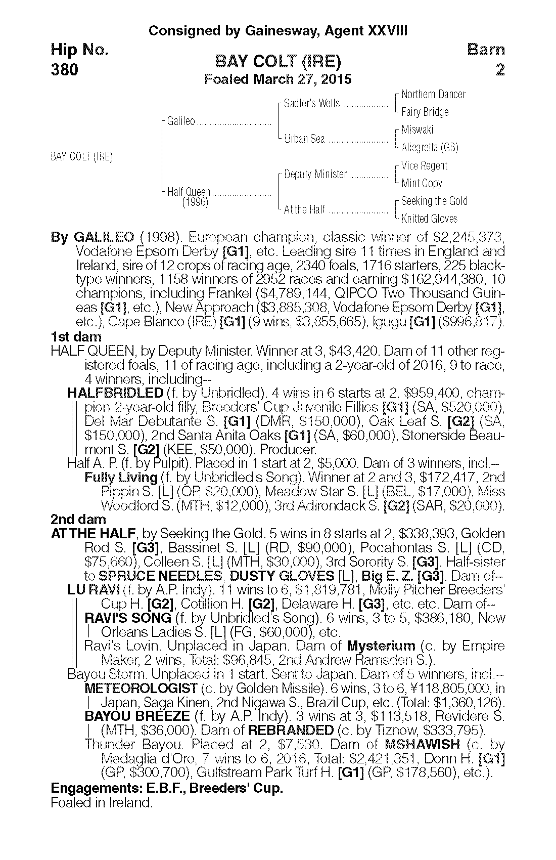 Justin Fung said the three September Sale purchases might remain in the U.S. to race and eventually could join the Aquis stallion roster. The War Front colt, consigned by Warrendale Sales, agent for Stonestreet Bred & Raised, is out of multiple Grade 1 winner Sassy Image, by Broken Vow. Consigned by Eaton Sales, agent, the Giant's Causeway colt is out of the Galileo (IRE) mare Alone (IRE), a full sister to Group 1 winner and Irish highweight Lush Lashes. The Galileo colt (below), an Irish-bred half-brother to champion Halfbridled, was consigned by Gainesway, agent.